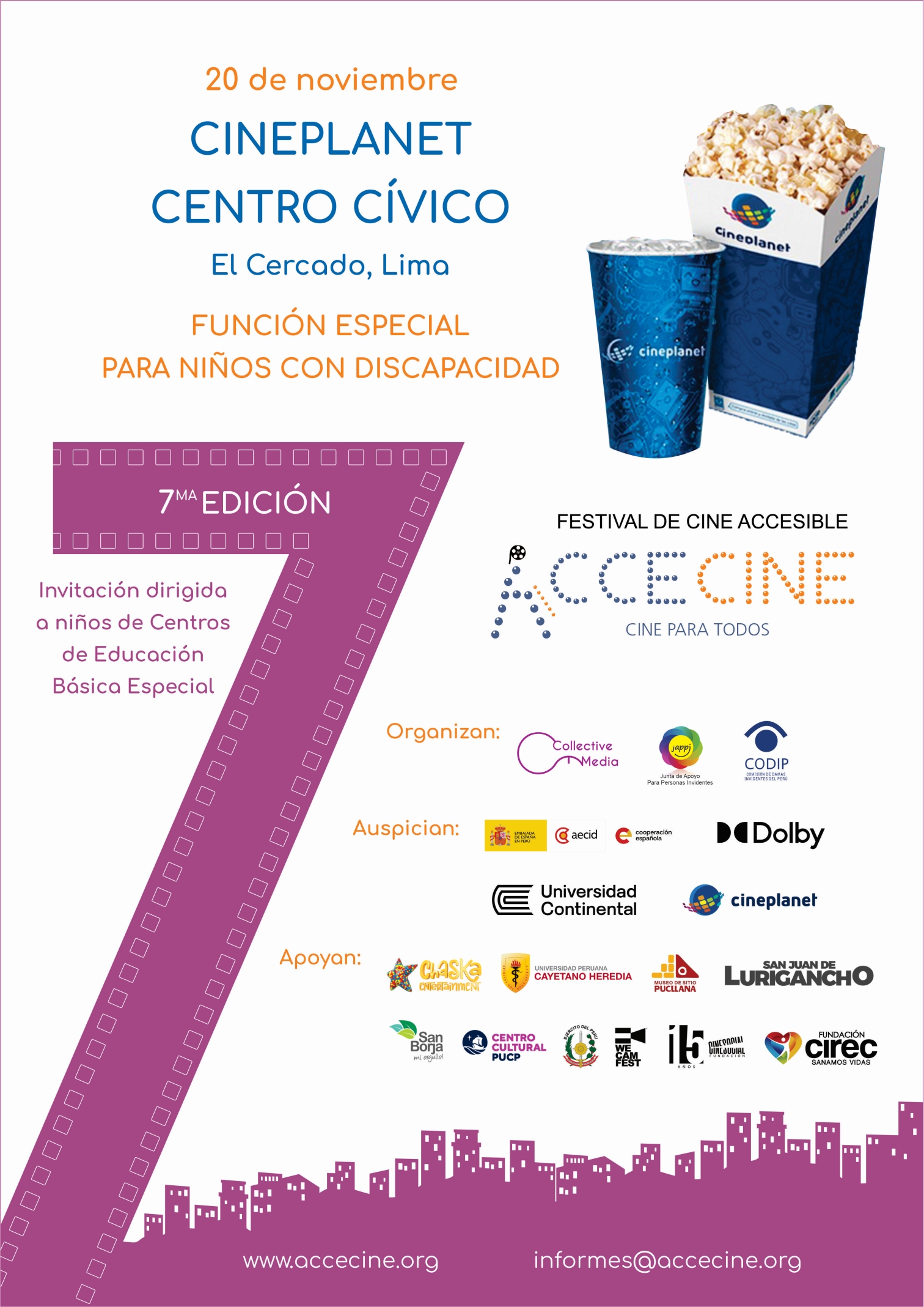 “AcceCine” es el único festival de cine en el Perú que ofrece a las personas con discapacidad sensorial la posibilidad de disfrutar del cine en formatos adaptados, atendiendo a sus necesidades específicas y brindando acceso al ejercicio pleno de sus derechos culturales.