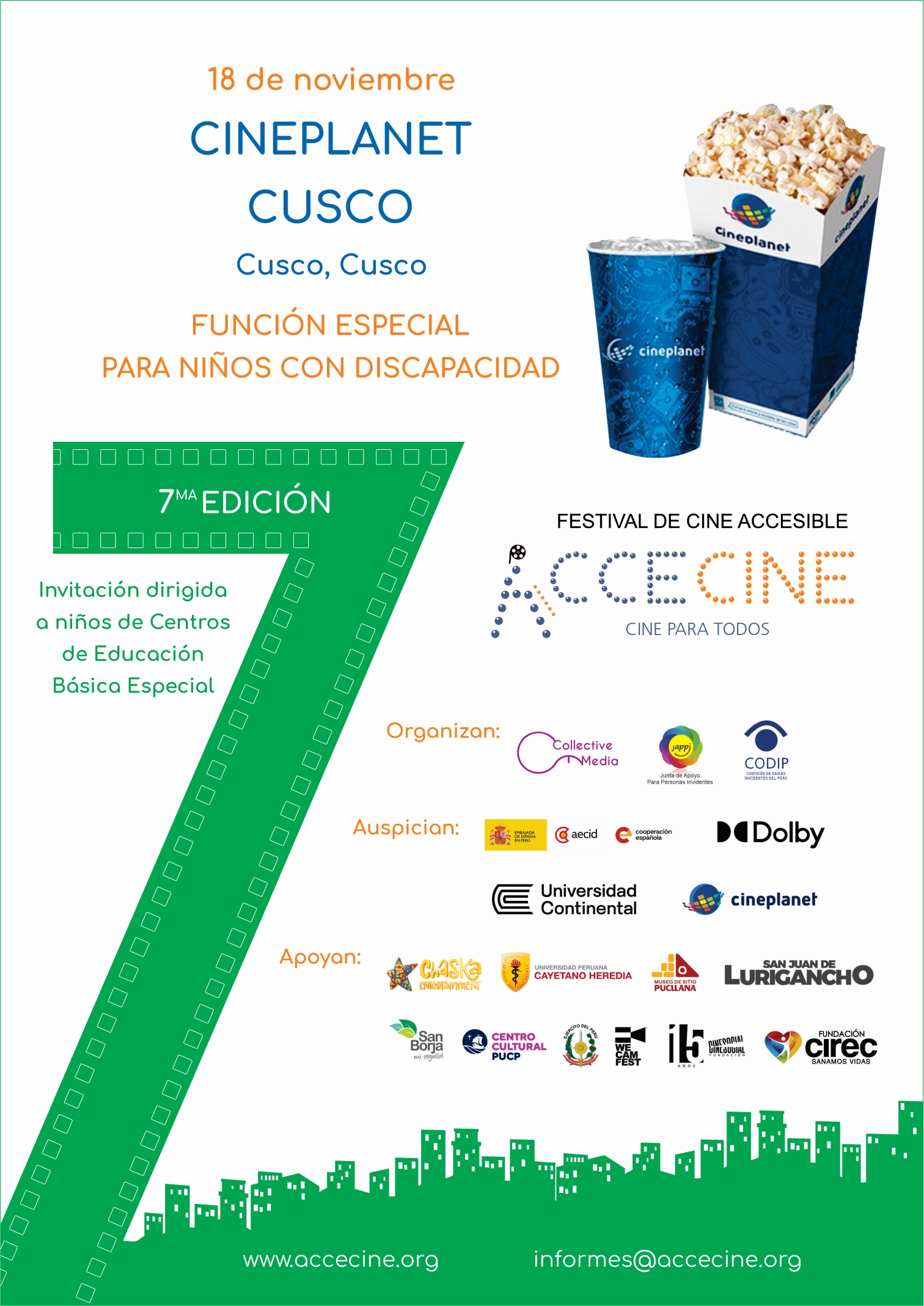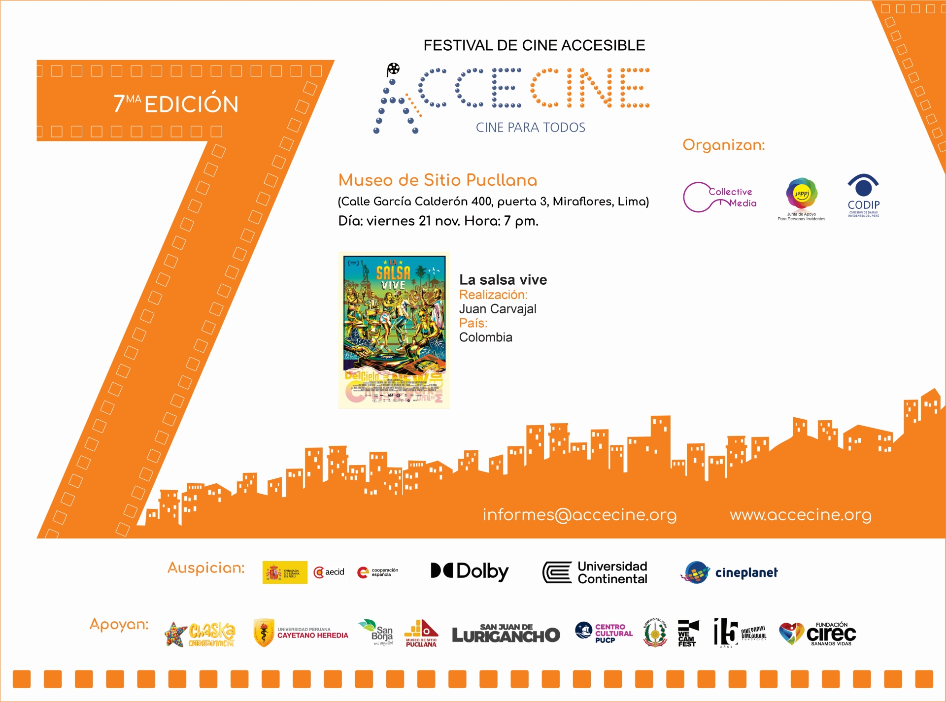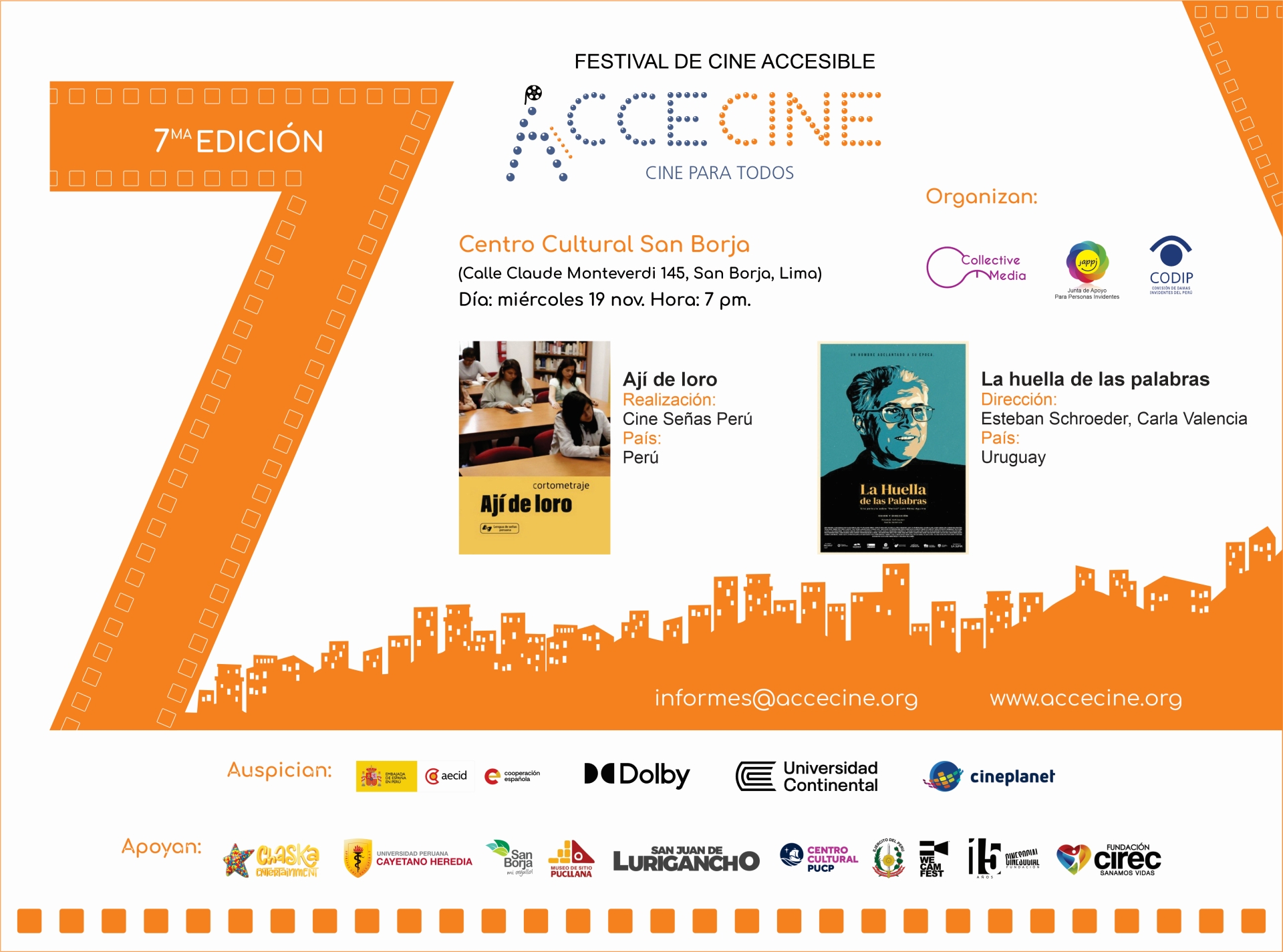 Agradecemos a los auspiciadores y aliados que creen en el poder del cine para encaminarnos a una sociedad más inclusiva y solidaria, donde todas las personas puedan disfrutar del arte y la cultura.