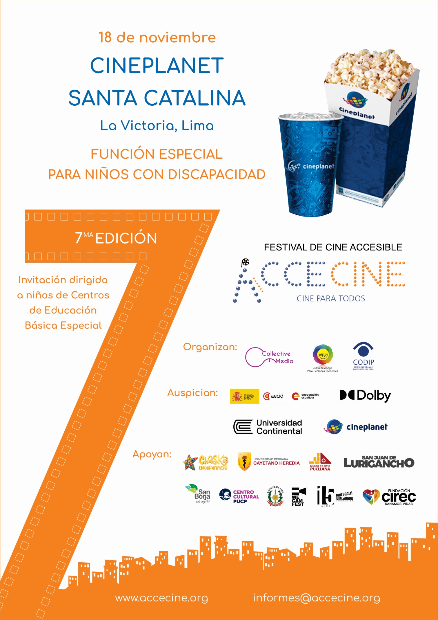 En esta séptima edición del Festival de Cine Accesible “AcceCine”, compartiremos una selección de películas de distintos géneros y formatos, todas con audiodescripción y subtitulado descriptivo. Además, tendremos algunas películas con Lengua de Señas Peruana (LSP), confirmando nuestro compromiso con una cultura inclusiva e impulsando la participación de todas las personas.