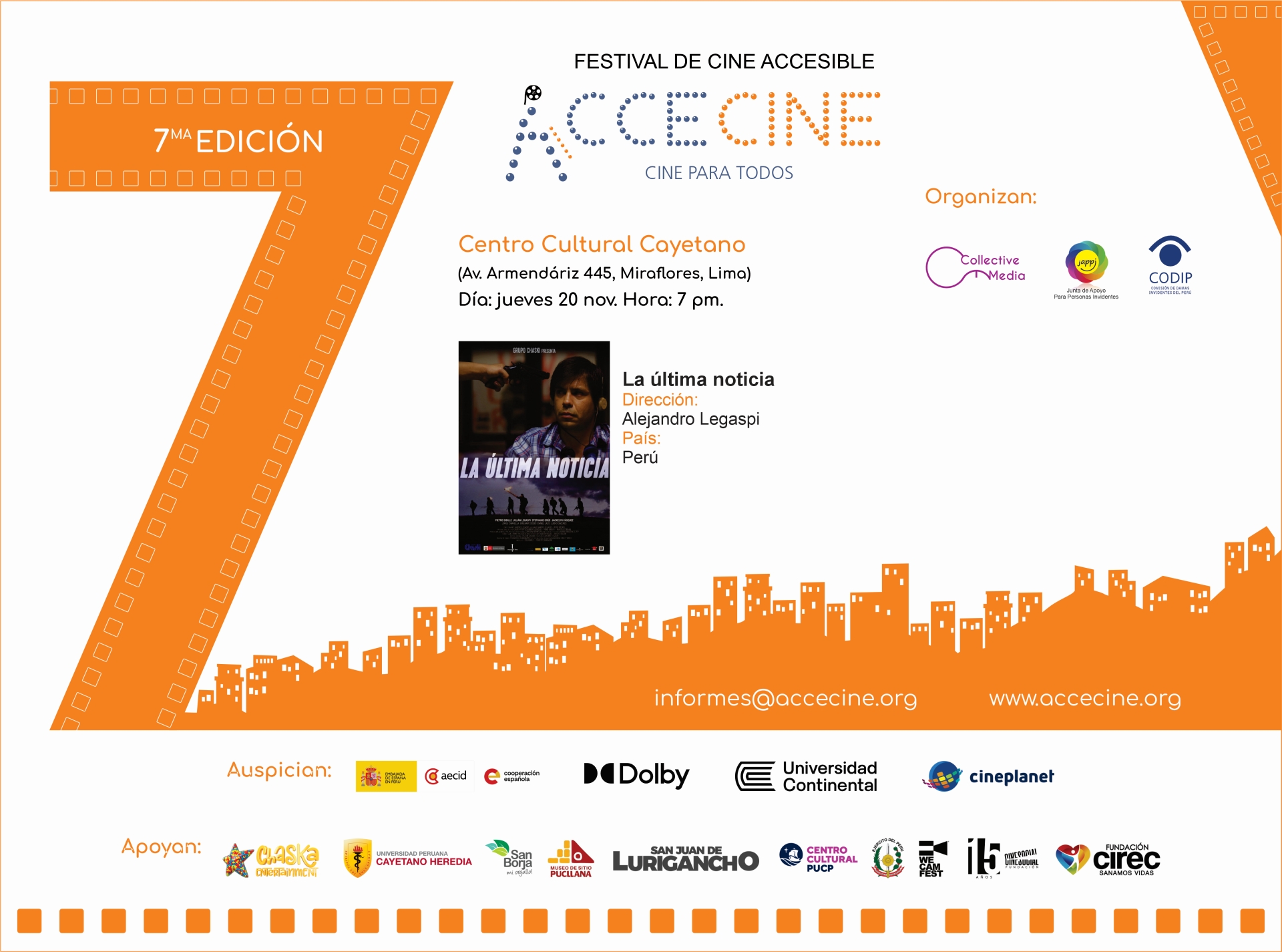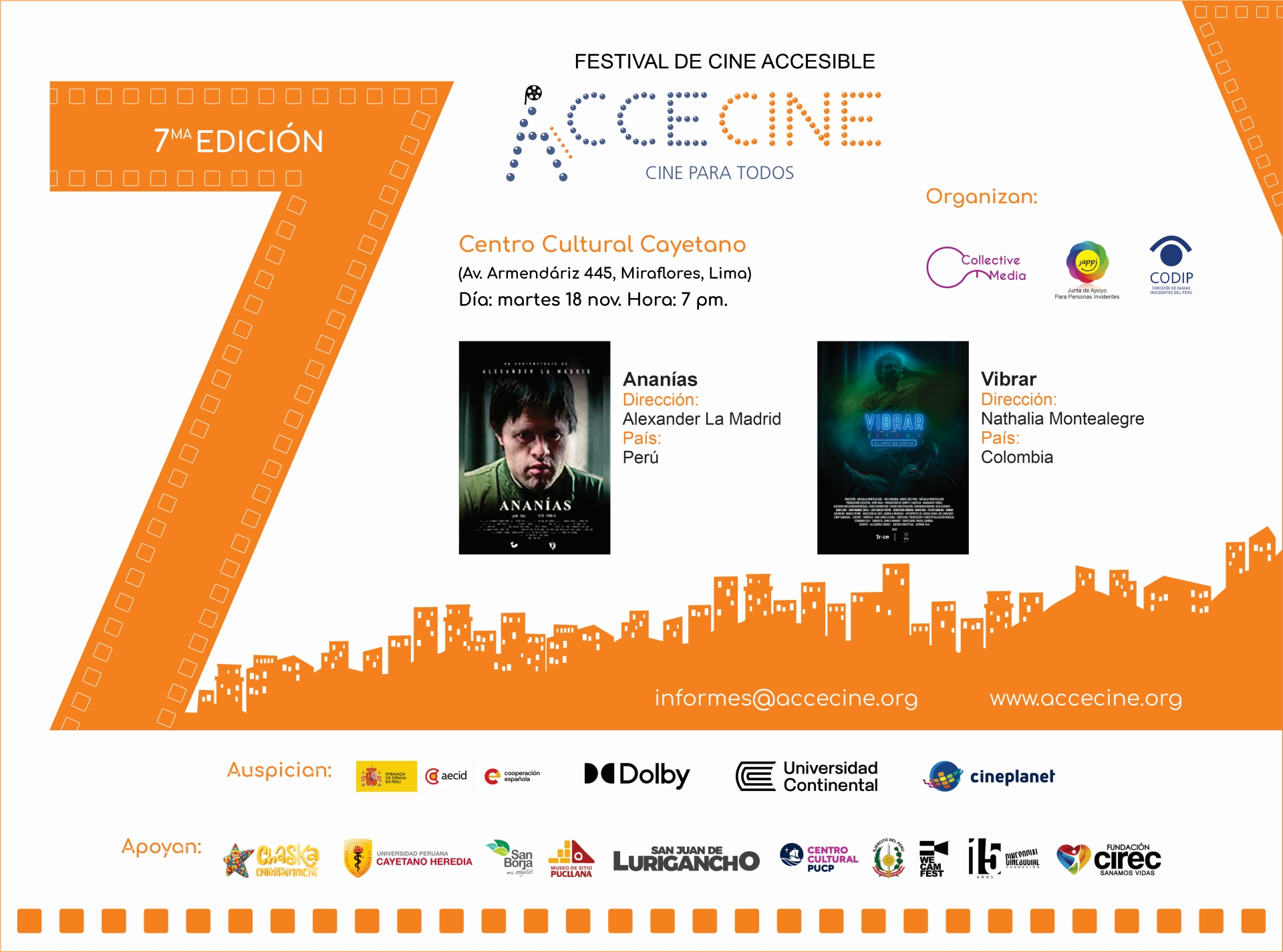 Agradecemos a los auspiciadores y aliados que creen en el poder del cine para encaminarnos a una sociedad más inclusiva y solidaria, donde todas las personas puedan disfrutar del arte y la cultura.